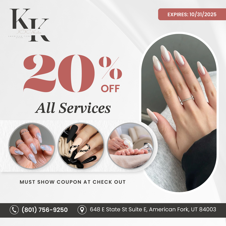 Welcome to KK Nails in 648 E State St Suite E, American Fork, UT 84003. We are more than just a conventional nail salon. We are the place where you can come and escape from your everyday stress and busy lifestyle, clients could enjoy the luxurious and comfortable atmosphere at affordable prices!